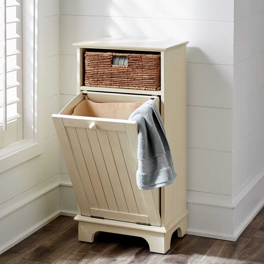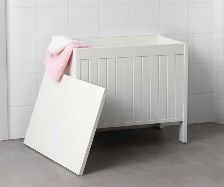 Производителями современной и стильной мебели для санузлов предлагается большое количество достаточно простых решений такой частой проблемы, включая установку специальных ванных гарнитуров со встроенными бельевыми корзинами.