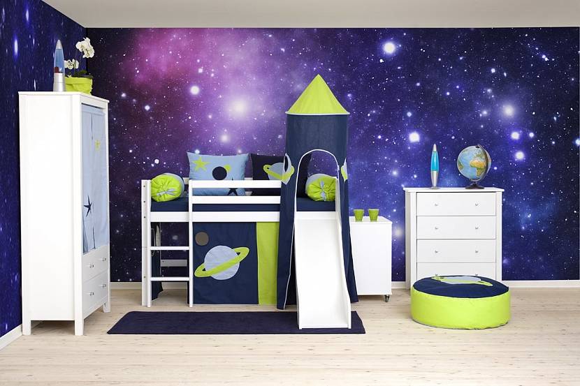 Если предполагается применение большого количества тематического декора, фон лучше делать нейтральным. Дизайнеры любят для этого использовать палитру лилового, глубокого синего или нежного лазурного. Если меблировка предполагается скудной, то не стоит ограничивать себя в выборе цветовой палитры. Все отвесные поверхности при этом можно превращать в звёздные созвездия или в очертания далёких Галактик.