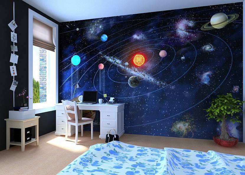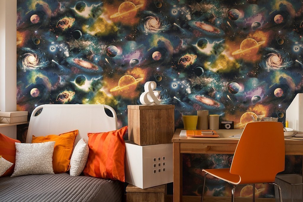 Стены несут в себе основной смысл дизайна. Но не спешите отражать на них все, что связано с космосом. Лучше остановите свой выбор на однотонных вариантах или обоях под покраску.