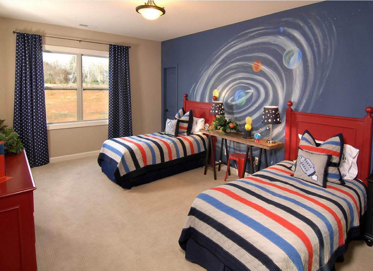 Обыгрывать тему можно во всем. Поэтому для мальчика нужно покупать пастельное белье со звёздными скоплениями, пледы и подушки с ними же. На пол стелются ковры с изображением солнечной системы или галактическими спиралями. Если в комнате много аксессуаров, то пол лучше сделать нейтральным, а это значит, туда нужно бросить серый однотонный палас.