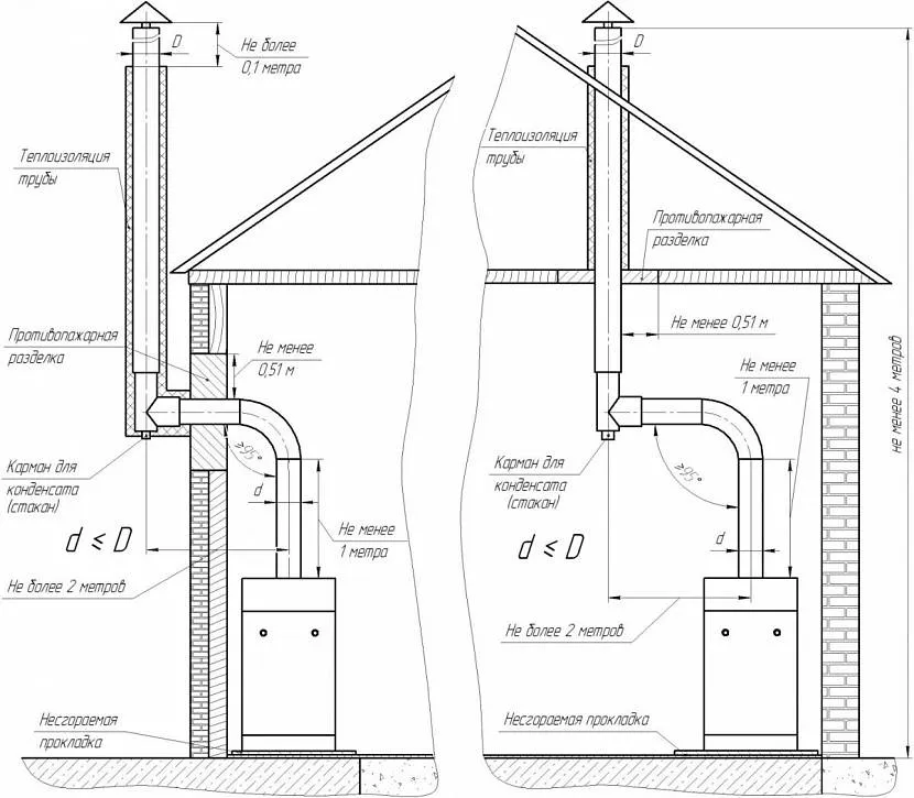 - рекомендуется, чтобы диаметр отверстия котла, предназначенного для вывода дымовых газов, был меньше, чем диаметр дымохода.