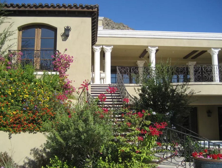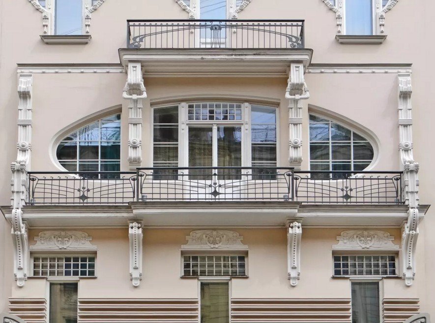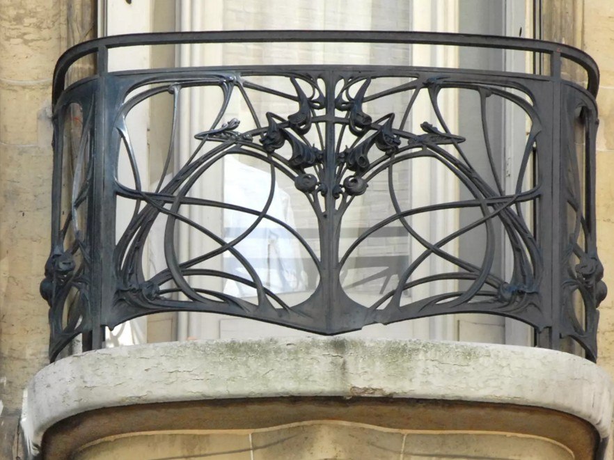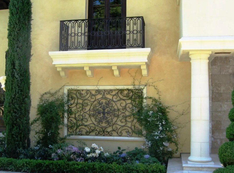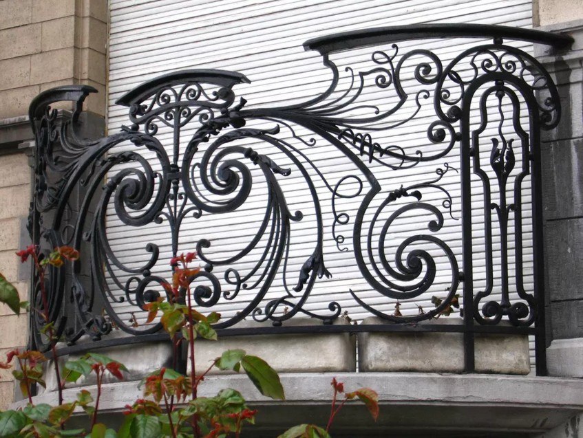 Одним из самых красивых и привлекательных элементов является растительный орнамент. Например, вьющаяся виноградная лоза, густо оплетающая балкон и поднимающаяся вверх по изогнутому металлическому шнуру.