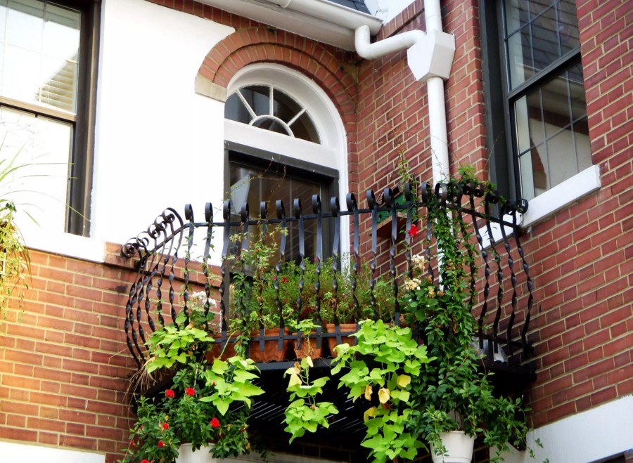 Внешние цветочницы делают ажурный кованый балкончик еще привлекательнее. Легкие металлические подставки позволяют разместить несколько небольших, аккуратных горшочков с пышной зеленью или разноцветными бутонами. Такая «живая изгородь» будет несколько месяцев радовать окружающих тонким, приятным ароматом и яркими красками.