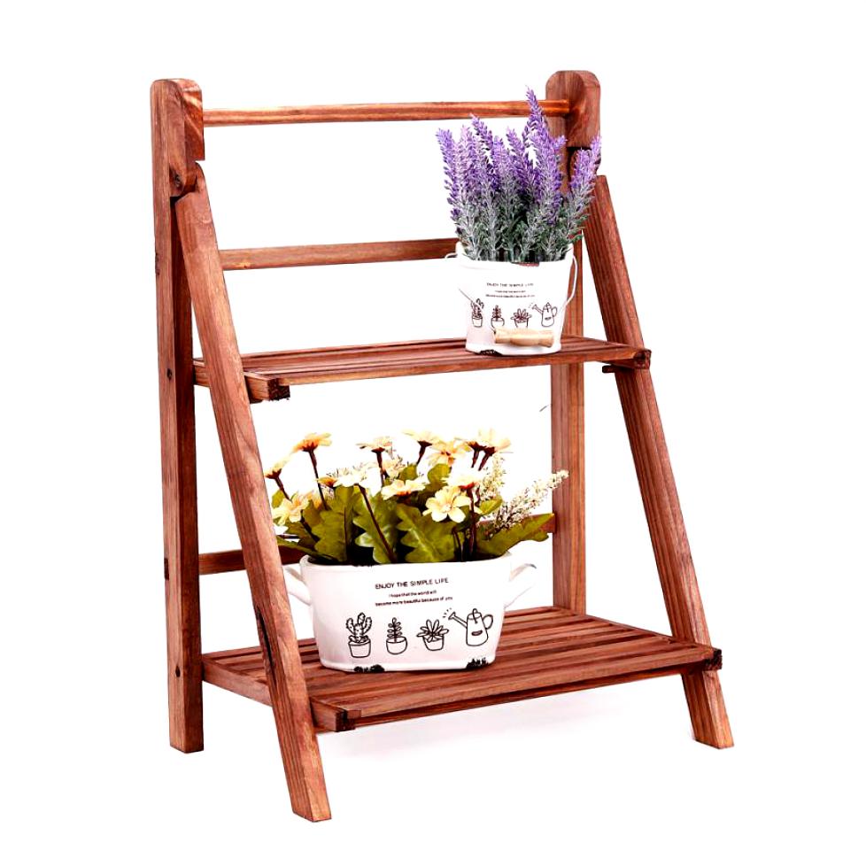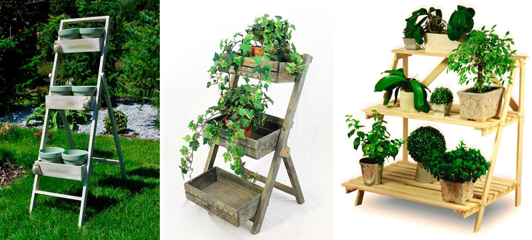 Конструкции с возможностью вертикальной установки горшков именуются этажерками. Они могут иметь вид колонны, когда полки располагаются строго друг под другом, либо стремянки – в этом случае полки будут располагаться лесенкой. Такие конструкции позволяют расположить растения с пышными кронами наверху, чтобы входящие в комнату могли видеть красоту, при этом более маленькие цветы не заслоняются от света и получают благоприятные для фотосинтеза условия. Домашние самодельные подставки этажерки для цветов популярны не только на террасах и в эркерах, но и в простой городской квартире. Они эргономичны, позволяют экономить пространство.
