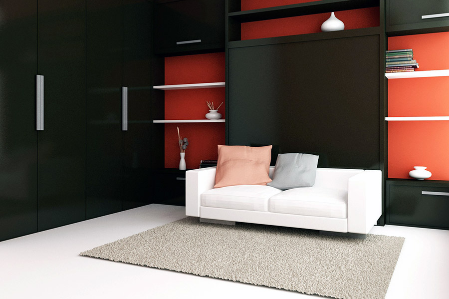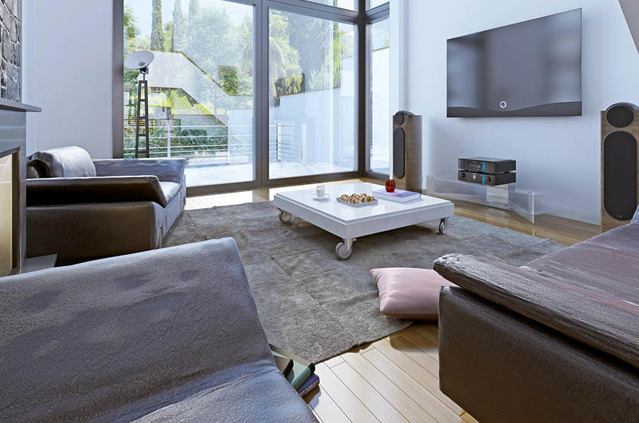 Отказ от декора — ключевая характерная черта хай-тека. Однако и тут не обошлось без модного ковра. Он не выделяется из общей картины интерьера, но смягчает технологичность атмосферы.
