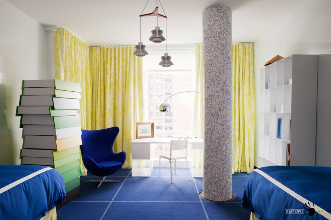 - Ковёр, располагающийся перед диваном и возле письменного стола, украшает помещение;