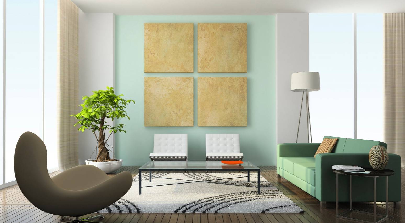 Использование паласов при декорировании помещения помогает визуально разделить площадь. Зону отдыха лучше застелить ковром пастельного оттенка без ярких орнаментов. Для оформления места для приема пищи можно воспользоваться однотонным ковром зелёного, оранжевого или персикового цвета.