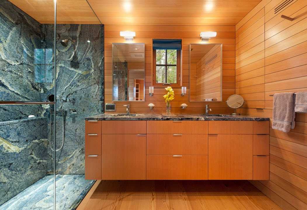 В душевых и ванных деревянная облицовка также имеет место быть
