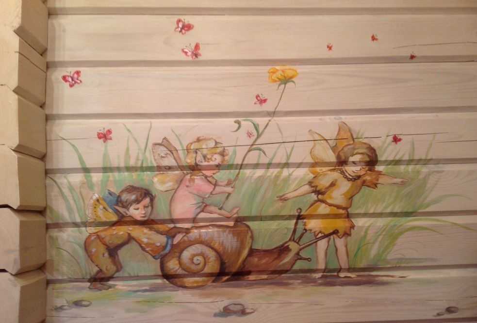 Если у вас есть хорошие навыки в рисовании, можно вагонку расписать. Только не забудьте потом всю картину покрыть бесцветным маслом или лаком — чтобы на дольше сохранилась. Этот прием можно использовать при оформлении детской комнаты.