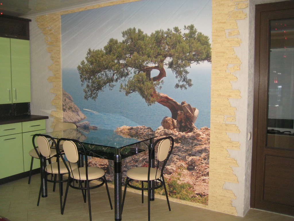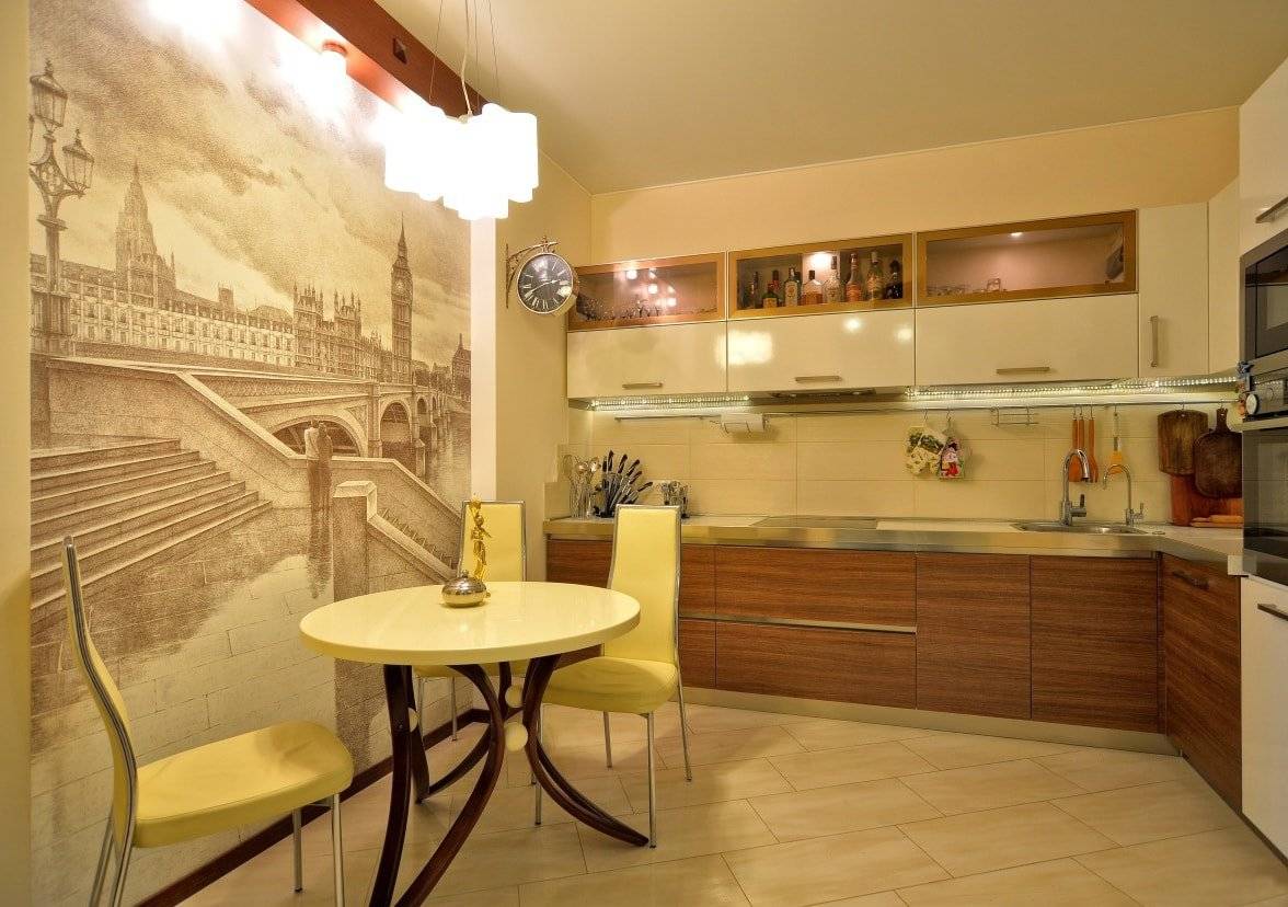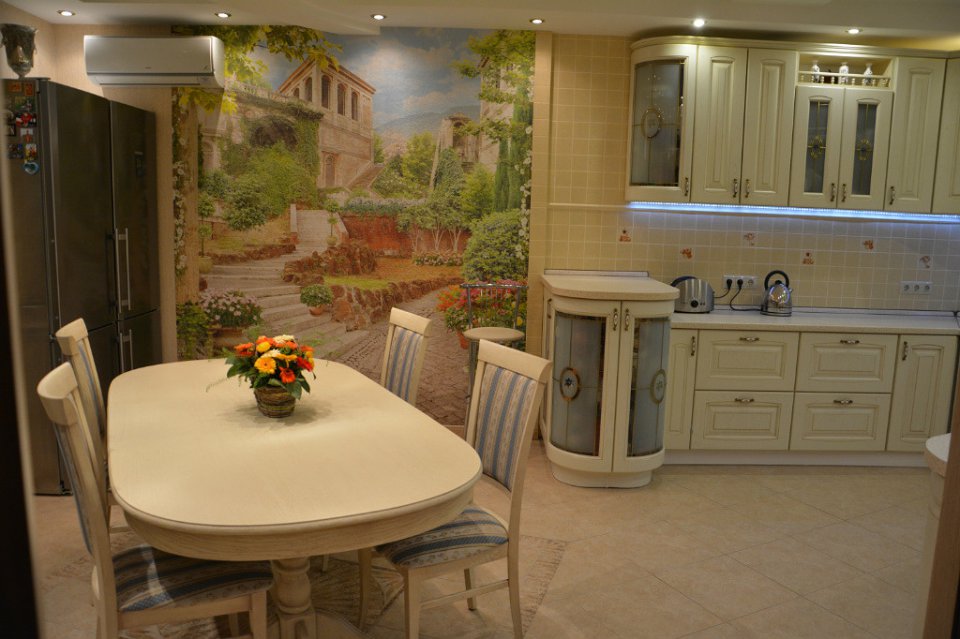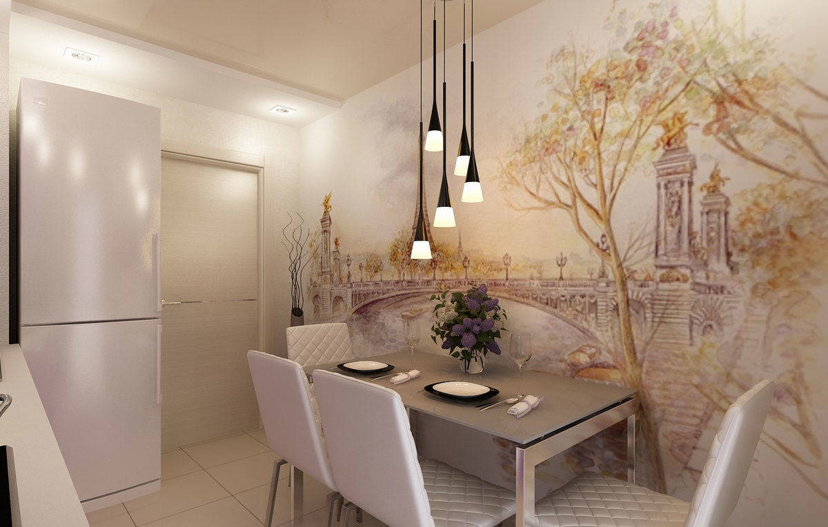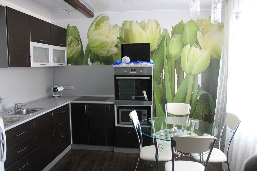 Фотообои позволяют легко изменить интерьер – придать объем маленькой кухне, увеличить высоту потолка, придать камерности большому пространству, зонировать кухню и т. п.