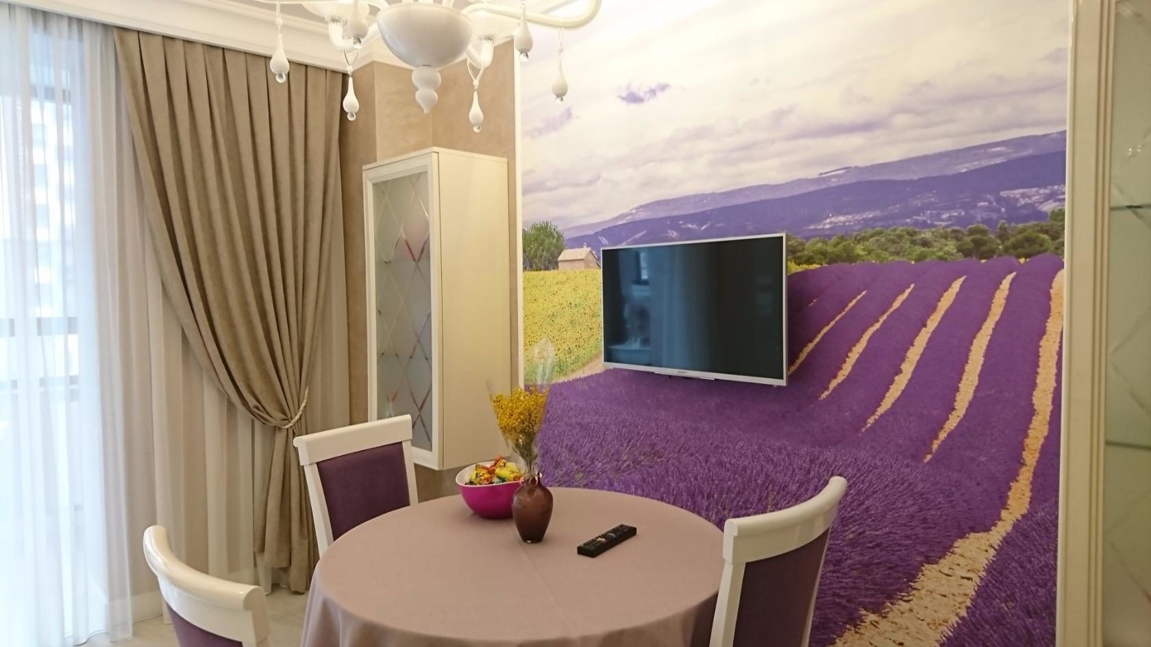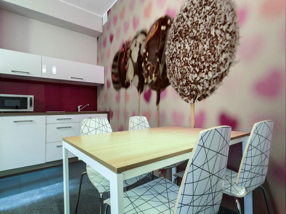 Если есть возможность, не расставляйте мебель возле акцентной стены или же клейте обои, начиная от уровня стола или кухонного уголка.
