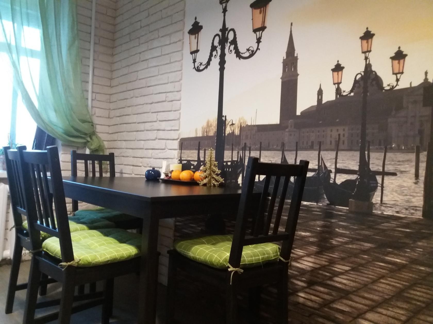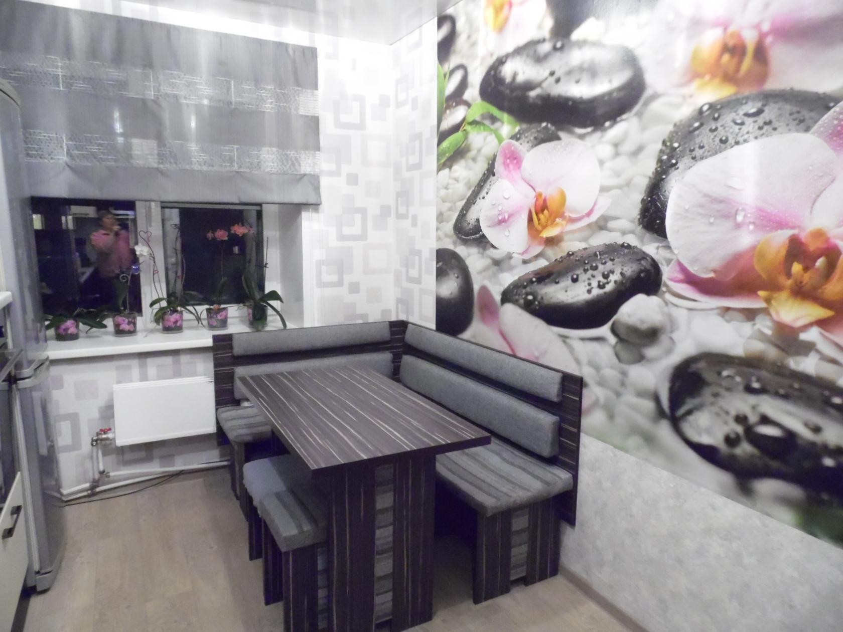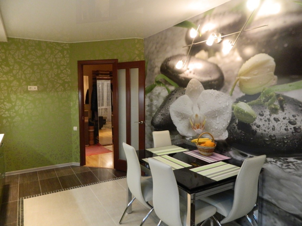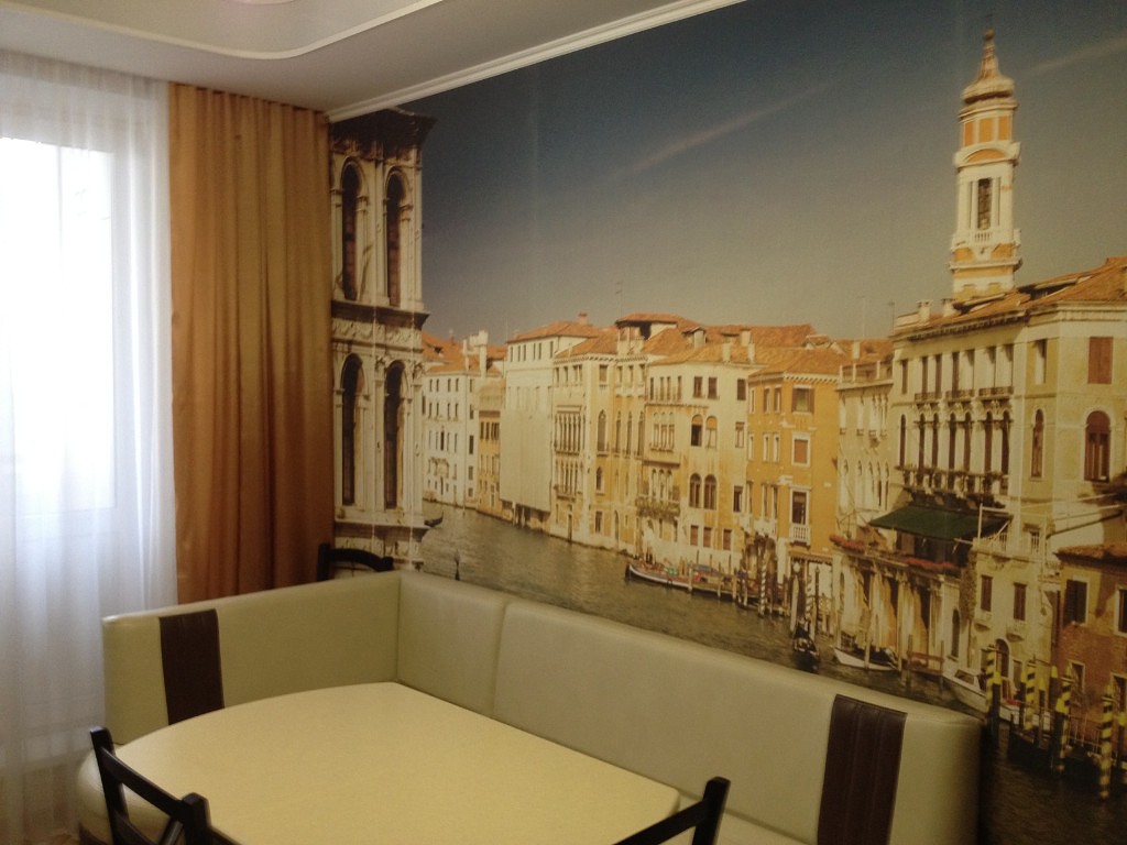 Оформляя кухню фотообоями, внимательно отнеситесь к выбору покрытия-компаньона. В его роли будут прекрасно смотреться базовые однотонные сдержанные обои либо однотонная краска.