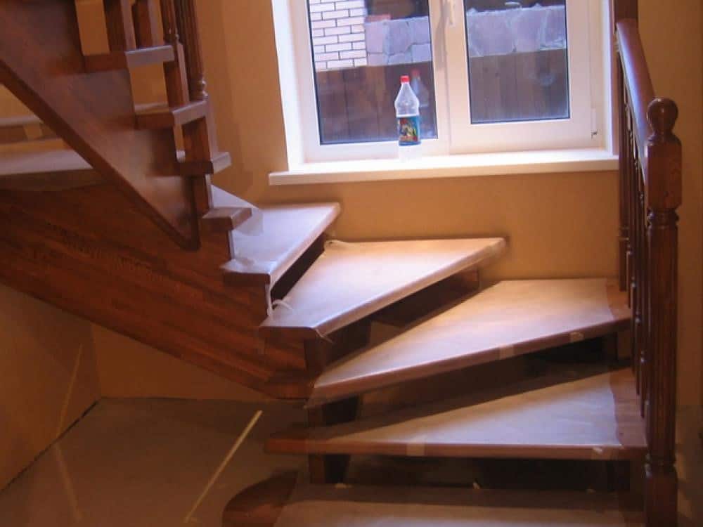 Модели с поворотами маршей устанавливают в углу или у стены. Площадки в них играют роль элемента, необходимого для разворота. Повороты выполняют на 90° или 180°. Двухмаршевые лестницы не занимают много места, но подниматься и спускаться по ним достаточно удобно. Забежные ступени в таких случаях просто незаменимы. Минимальное занимаемое место при 3-метровой высоте этажа — 160х180 см.