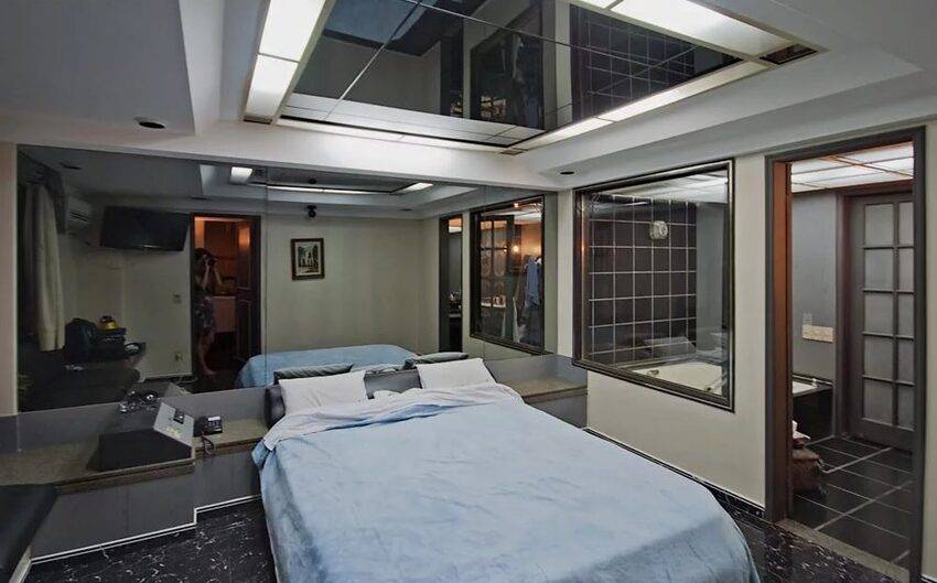 Оригинальное решение — зеркальные стены в спальне.
