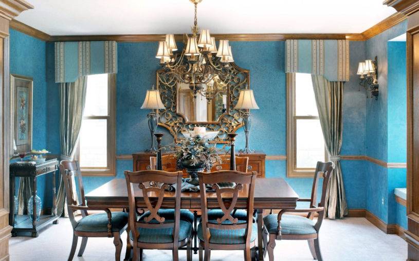 К шикарной обстановке рабочего кабинета подойдет бирюзовый оттенок штор, а для спальни – умиротворяющий голубой. Для большой комнаты подойдут светлые шторы под светлые обои.