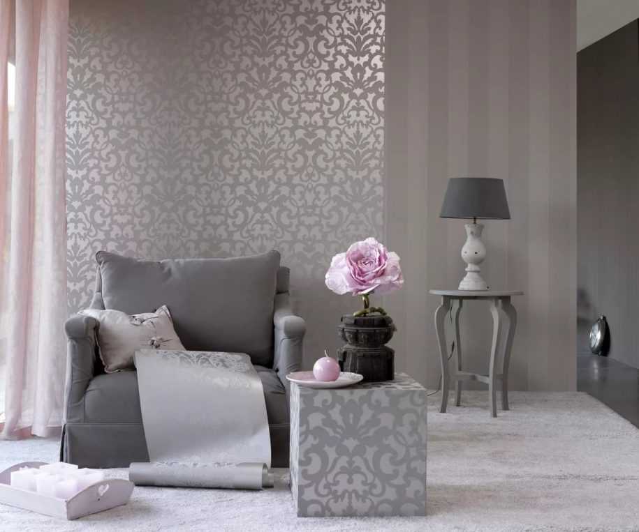 На фото можно видеть, что с серыми обоями, можно комбинировать и различные оттенки.