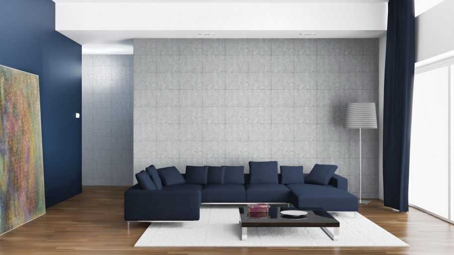 Такой интерьер смотрится расслабляющее и умиротворённо. Глубокий синий цвет хорошо подходит для обивки мягкой мебели, текстильного декора, штор. Если комната не слишком просторная, стены лучше сделать светло-серыми, используя краску или штукатурку. С серо-синей гаммой хорошо сочетается серебряный цвет, а также керамогранитная плитка под камень.