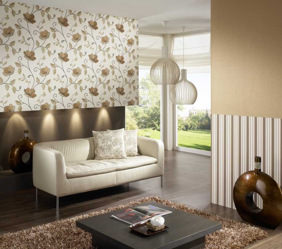 Комбинирование разных видов – это один из лучших вариантов в современном интерьере гостиной. Это тот случай, когда можно экспериментировать. Используйте одновременно несколько вариантов, только не забывайте расставлять акценты. Варианты с вертикальными и горизонтальными полосами, бордюрами помогут сделать интерьер гостиной стильным.