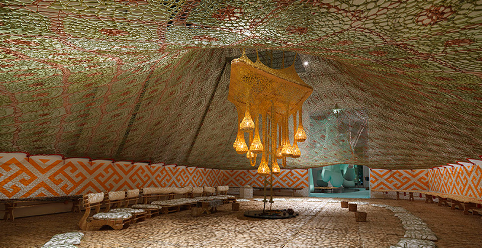 Following the tradition of Brazilian Modernism that advocates the idea of viewer’s presence and active participation, Neto’s installation Boa, placed at Museum of Contemporary Art Kiasma in Helsinki, from March until September 2016, again gives the opportunity to escape from the stress of everyday life by devoting some time to senses. This time, the artist was inspired by tradition and rituals of Huni Kuin, the indigenous tribe from the Amazon rainforest who truly believe in binding with nature and other living things. Borrowing the shape of the head of a boa constrictor, his new installation contains the same essence as the previous with an additional view on respect of the cultural differences.