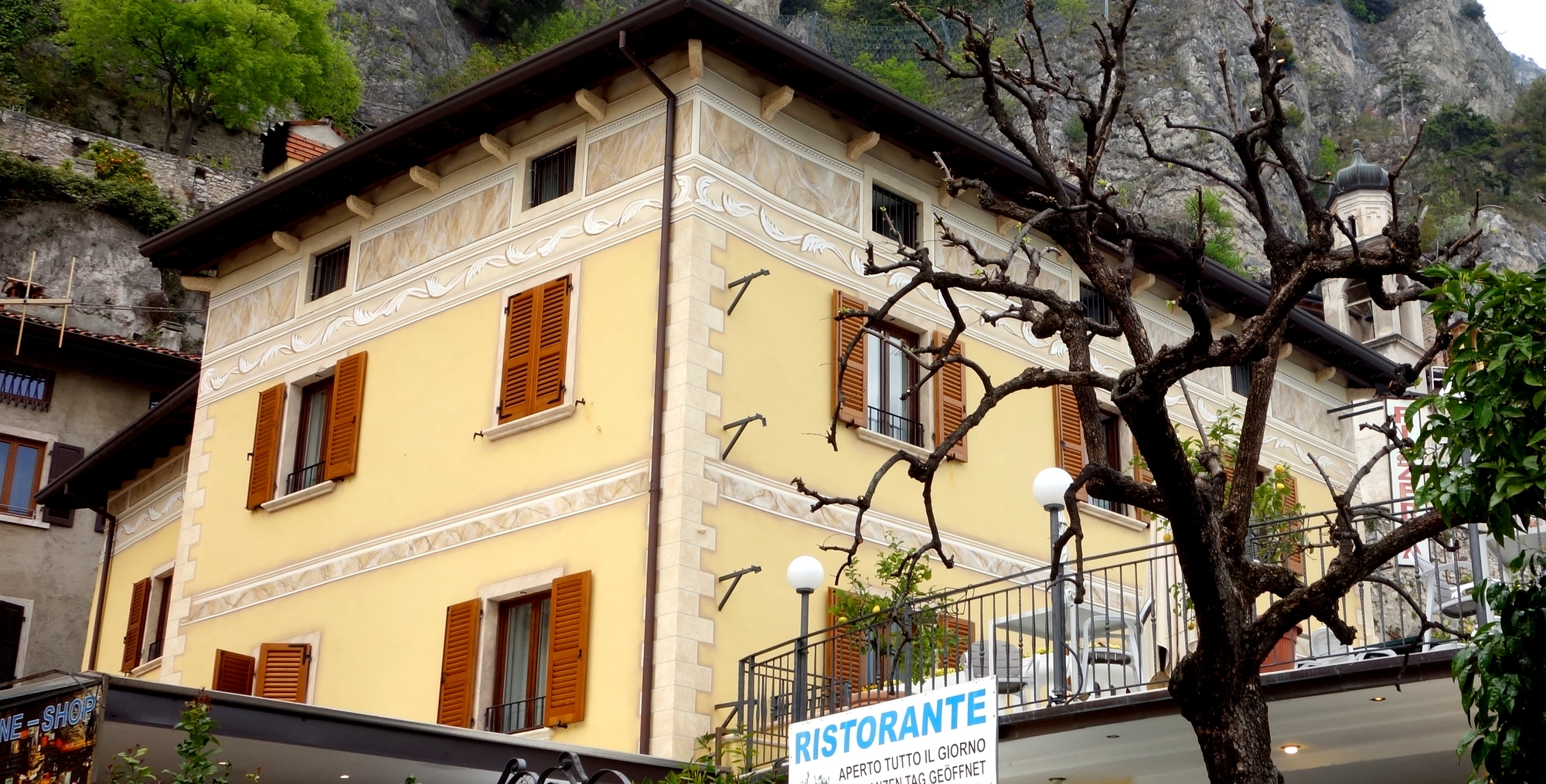 В Италии также традиционна роспись фасадов стен. Штукатурка не отваливается, краски не выгорают под ярким южным солнцем. В Рива-дель-Гарда на уровне мансардных этажей на стенах лепнина или декоративная роспись на стене.