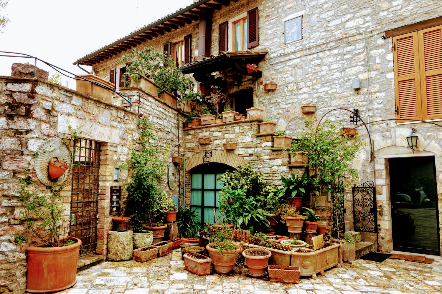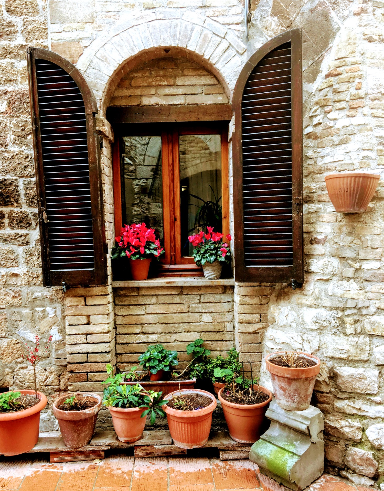 Старые домики в глубинке Италии с облупившимися стенами, потемневшими от времени ставнями и обветшалыми окнами как нельзя лучше подчеркивает великолепие цветочных композиций. (Ассизи)