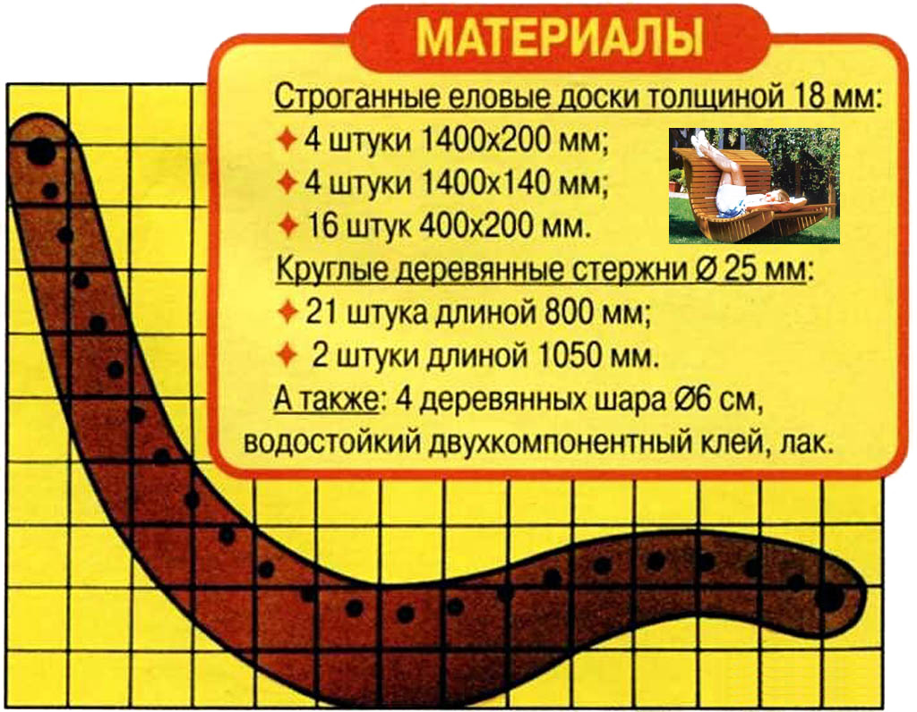 И те, и другие запросы удовлетворит садовая качалка-лежак на эллиптических полозьях и с тентом. Размеры ее боковин даны на рис; их материал – фанера 24 мм. Ширина ложа – до 900 мм, ее обшивка из реек 50х50. Места боковин, обозначенные серыми кружками, соединяются круглыми деревянными поперечинами диаметром от 60 мм.