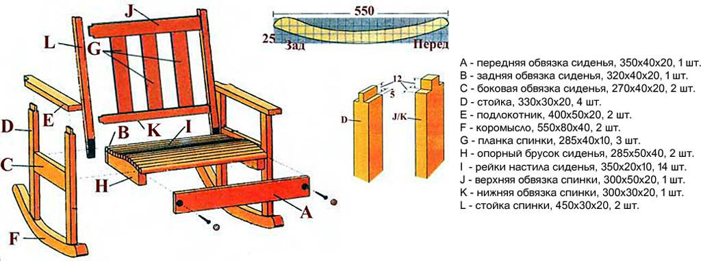 Устройство детского кресла-качалки, схема его сборки и спецификация деталей даны на рис; материал – дерево. Мало-мальски опытному домашнему мастеру соорудить кресло-качалку для ребенка, руководствуясь этими данными, не составит большого труда, а начинающие могут прежде посмотреть мастер-класс по изготовлению почти такой же детской качалки.