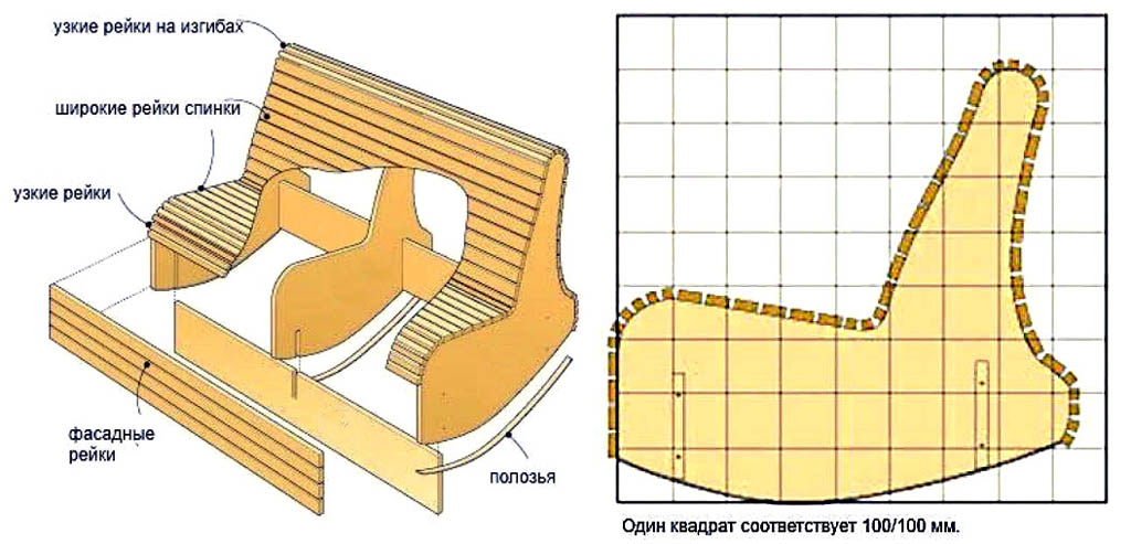 - Чтобы придать конструкции выгнутую форму, к спинке и сиденью, которые были сделаны из фанеры 4 мм, приклеивают тонкие планки (10мм). Все элементы фиксируют водостойким клеем ПВА.