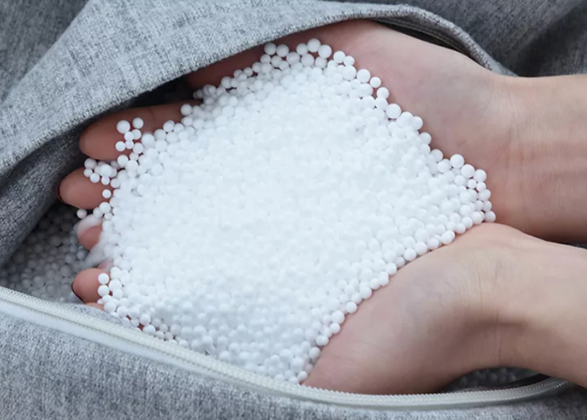 Пенопласт для набивки производится в виде небольших шариков. Материал легкий, бюджетный, отличается небольшой усадкой, комфортной, мягкой фактурой, плотностью. Форма шариков пенопласта долго сохраняется, но при длительной эксплуатации увеличивается жесткость состава. Рекомендуется добавлять в материал поролоновую крошку либо холлофайбер.