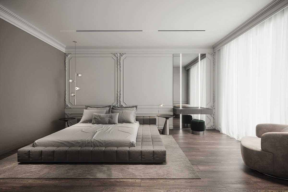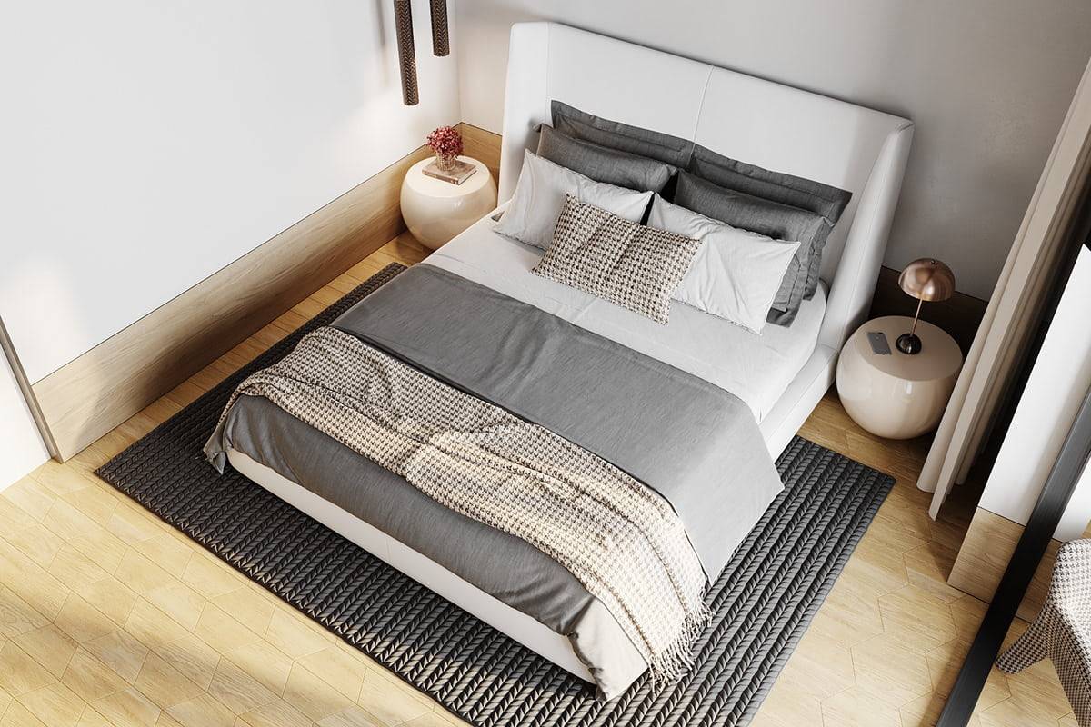Тонкие ножки являются предпочтительными и здесь. В дополнение к ним дизайнеры советуют выбирать натуральную ткань (лен, хлопок) природных оттенков – серого, бежевого и т.д. Такой дизайн кровати отлично впишется в интерьер спальни в стиле лофт, эко или ретро, а также в современный и скандинавский стиль. Универсально, но круто!