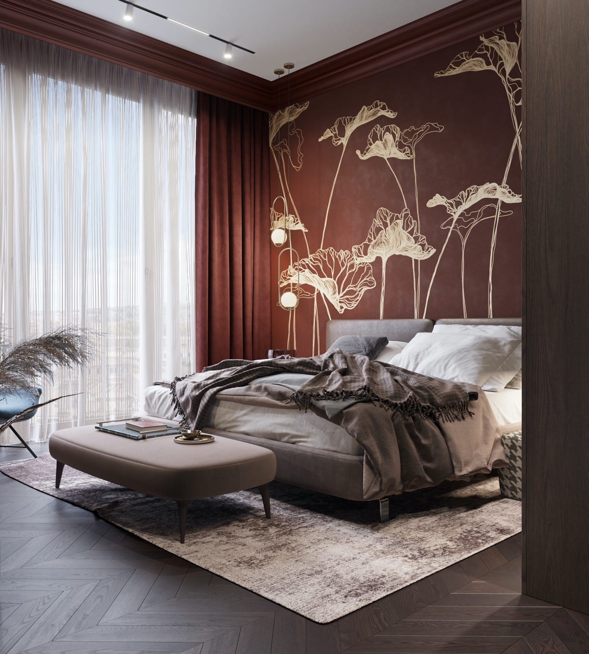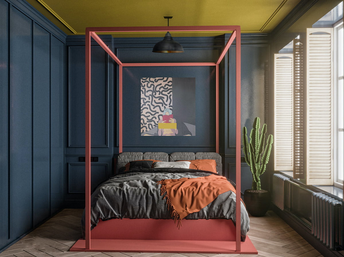 Для создания более камерной атмосферы спальню можно покрасить в глубокие тона (изумруд, индиго, бордо), но при этом важно учесть количество света, попадающего через окна. На северной стороне тёмное помещение будет казаться ещё более мрачным. Если вы любите насыщенные оттенки, оформите цветными красками или обоями одну стену за изголовьем