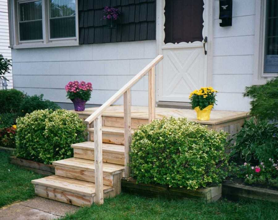 На даче чаще всего встречается самый простой вариант, где высота лестницы чуть выше, чем высота фундамента. Наличие или отсутствие перил – дело удобства и вкуса.