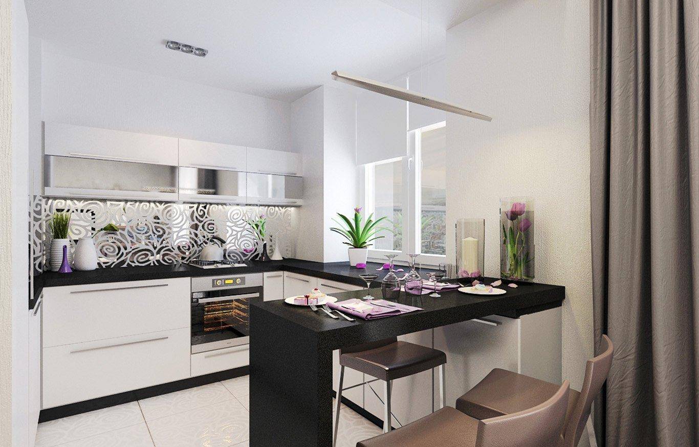 Низкие барные столы (85-95 см) делают вровень со столешницей и они одновременно выполняют роль стола и рабочей поверхности. Обычно выглядят как полуостров, часто используются для зонирования кухни-гостиной или устанавливаются у окна, при выходе на балкон.