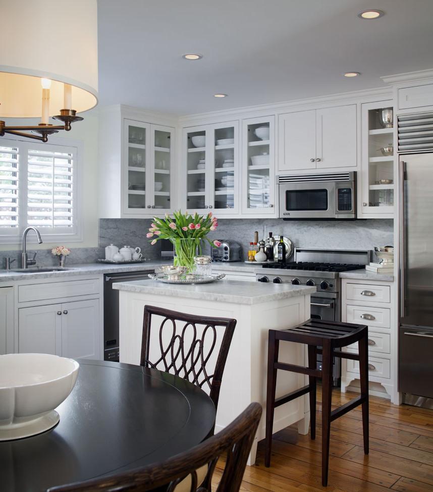 По принципам классики, на кухне обязательно должен присутствовать небольшой стол со стульями в качестве обеденной зоны. Но его можно заменить современными столешницами из искусственного камня, барными стойками или «островами».