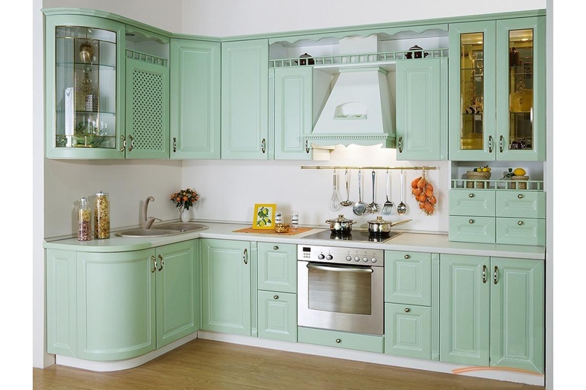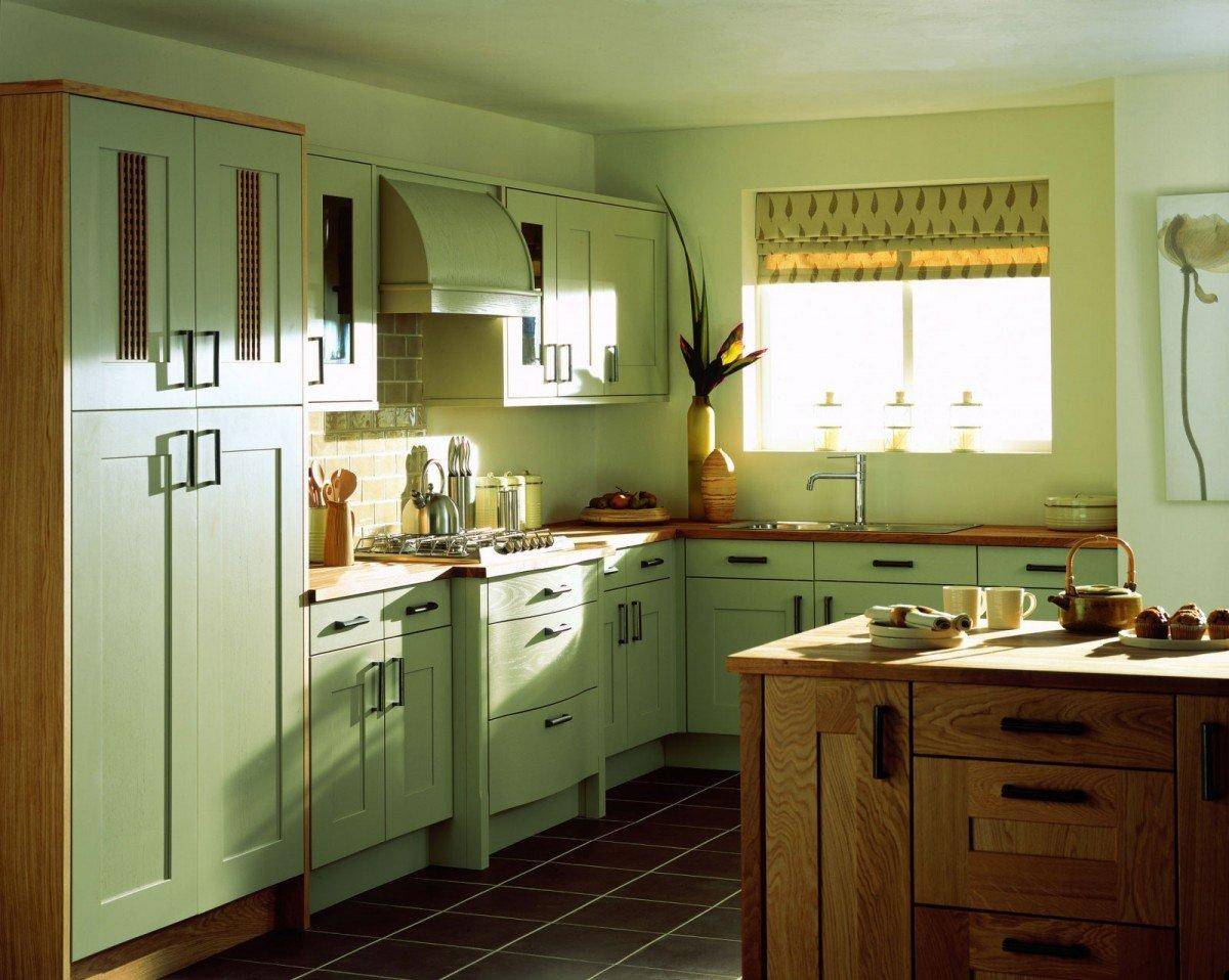 Если помещение достаточно просторное, то стены можно покрасить в оливковый цвет. Фисташковый гарнитур на таком фоне выглядит легко и нежно.