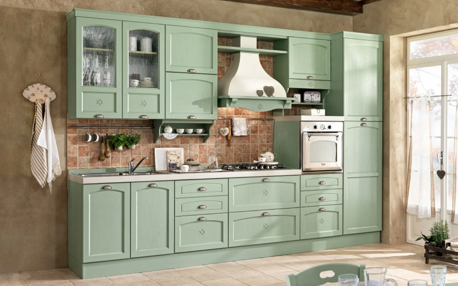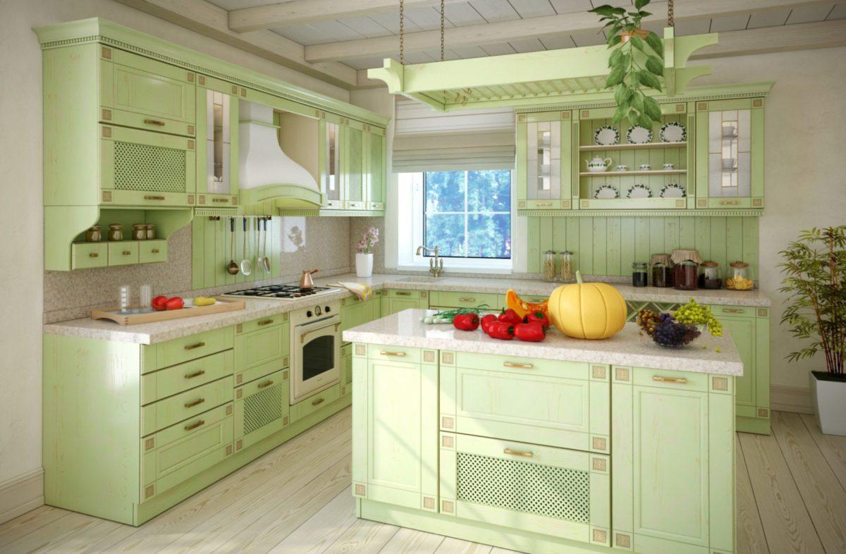 Дизайн кухни в стиле кантри, прованс либо классика нельзя представить без фисташкового. Он очень хорошо выглядит в сочетании с деревянной мебелью, естественными материалами и светлым текстилем, улучшает аппетит.