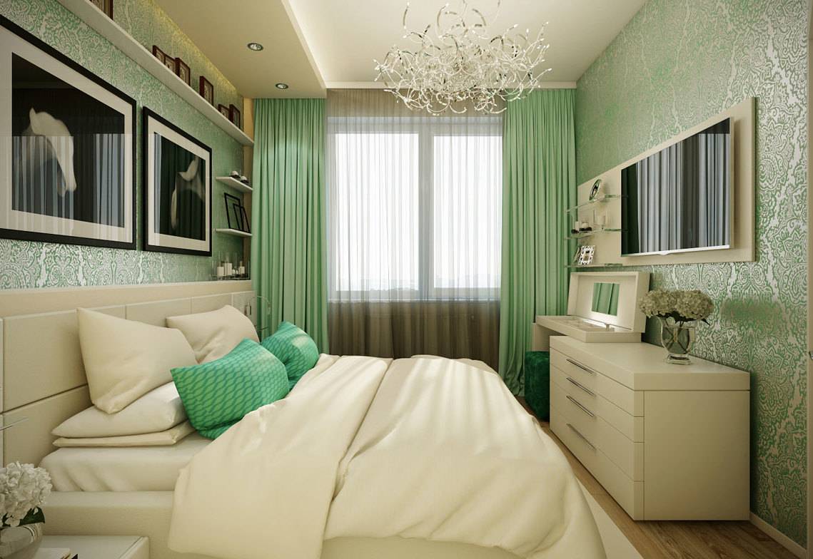 Потолок и пол в этом случае стоит сделать матово-белыми или бежевыми, а текстиль и декор подобрать в зеленоватой гамме.