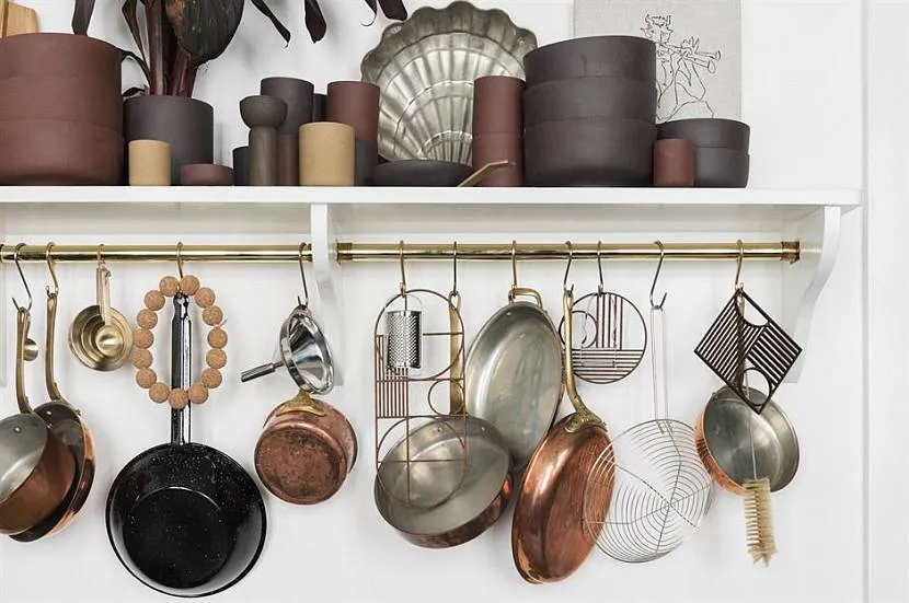 Если в кухонных шкафах недостаточно места, чтобы уместить всю посуду, ее можно хранить на крючках. Это интересный и эклектичный способ придать кухне глубину и винтажный стиль.