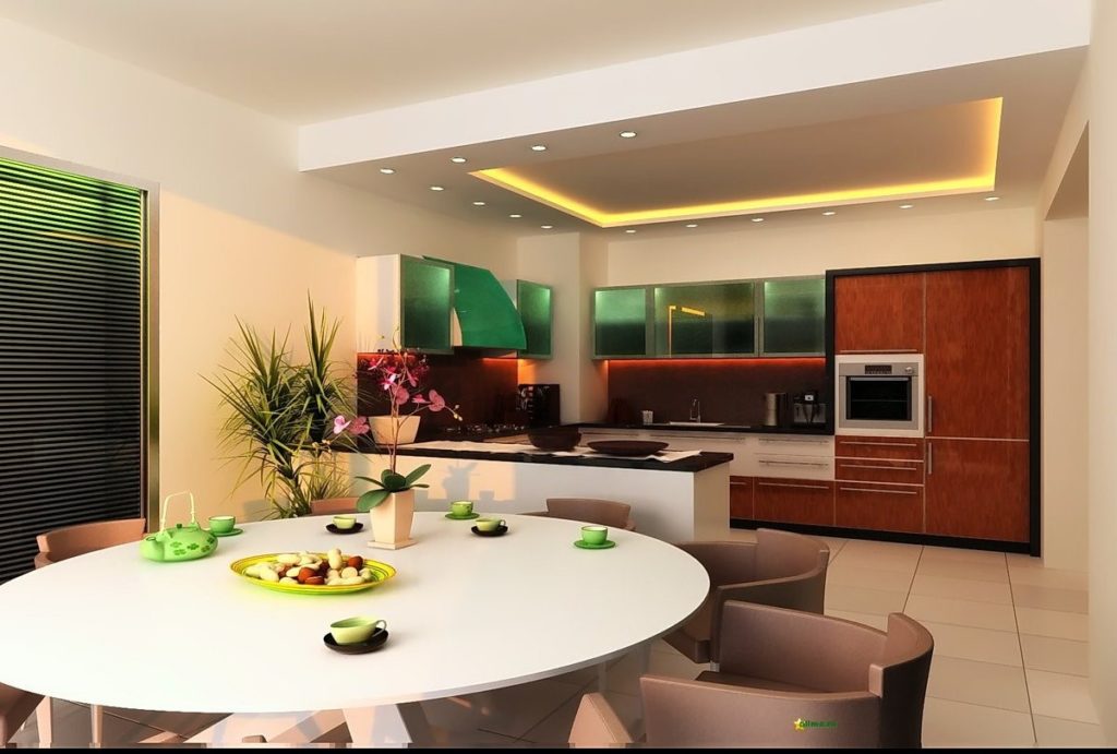 В зависимости от ваших потребностей в кухне устанавливается маленький или большой обеденный стол. Довольно часто вместо привычного большого обеденного стола устанавливают удлиненный прямоугольный стол или барную стойку. Это зависит от вашего вкуса и потребностей, количества членов вашей семьи, количества гостей которых вы принимаете.