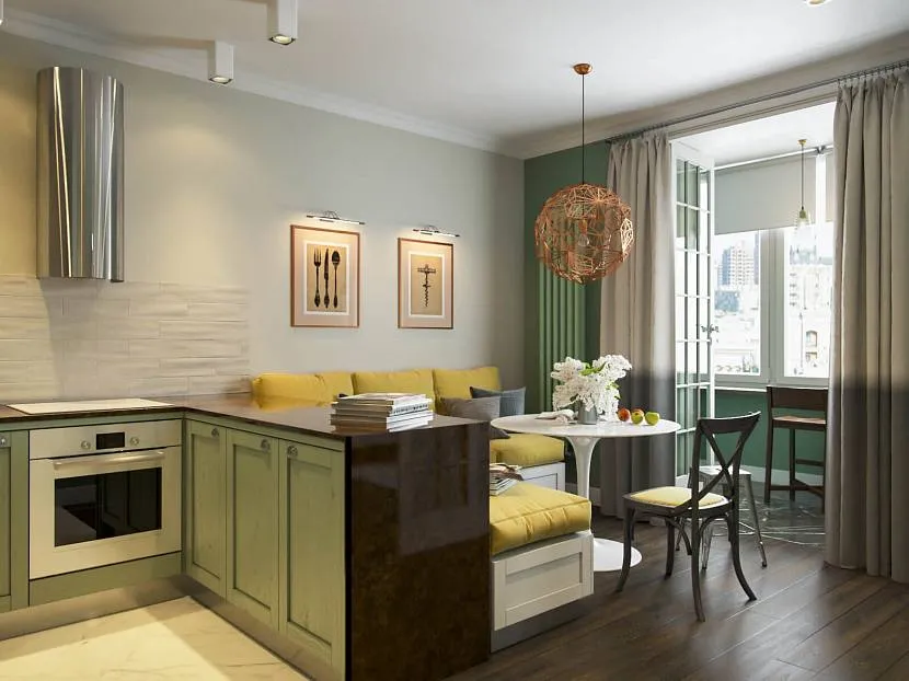 Мягкий диван на объединенном пространстве сегодня может выполнять множество ролей. Многие используют его в качестве перегородки между зоной отдыха и кухней, другие нашли применение мягкому уголку в качестве стульев для обеденной зоны. Диваны способны наполнить пространство теплом и уютом, аккуратные и внешне привлекательные наполняют атмосферу кухни комфортом.