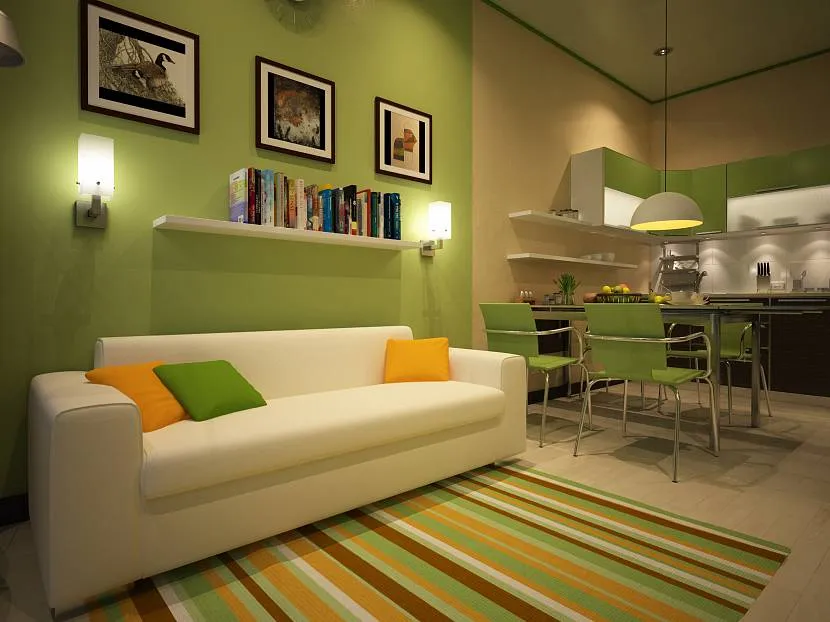 Яркий современный дизайн для маленькой гостиной объединенной с кухней