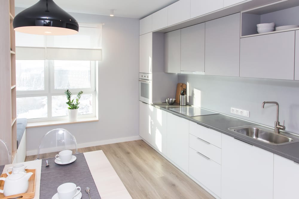 Линейная планировка предусматривает размещение гарнитура вдоль длинной стены, а обеденной зоны – напротив. Установка мебели по прямой, в первую очередь, подойдёт для узких вытянутых кухонь, для которых этот вариант может быть единственным. Оптимальным будет и в других случаях.