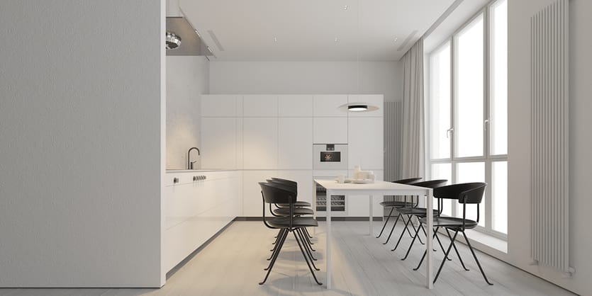 Темный пол на белой кухне создает эффект заземления пространства, сохраняя воздушность кухни, но убирая эффект невесомости. Легко с этим справляется темный деревянный пол.