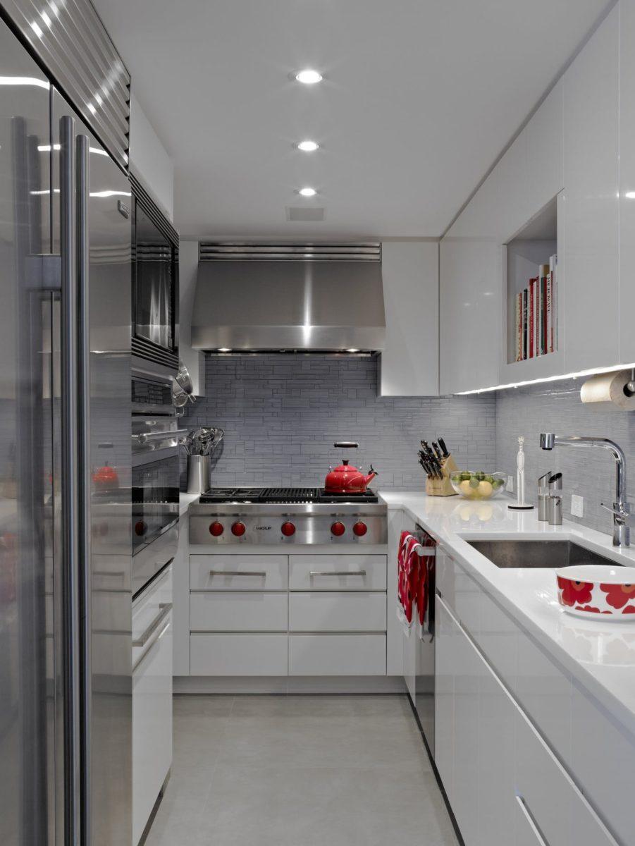 Такой строгий дизайн с футуристическим настроением и ровными глянцевыми поверхностями, отражающими свет, хорошо смотрится в малогабаритных помещениях. Форма гарнитура может быть как привычной угловатой, так и необычной (к примеру, угловой гарнитур со скруглёнными боковыми тумбами и очень лаконичной мойкой). В качестве основных цветов лучше выбирать белый, серый, металлик; уместны будут и вкрапления ярких тонов (например, шкафы с красными или салатовыми фасадами).