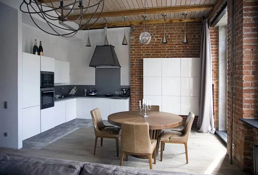 Лофт. В оформлении обеденной зоны на кухне в промышленном стиле не обойтись без мебели аскетичной формы с металлическим каркасом. Столешницу лучше выбирать деревянную; хорошо, если она сделана из цельного среза (слэба). Стулья могут быть разными по исполнению; их может дополнить кожаный диванчик.