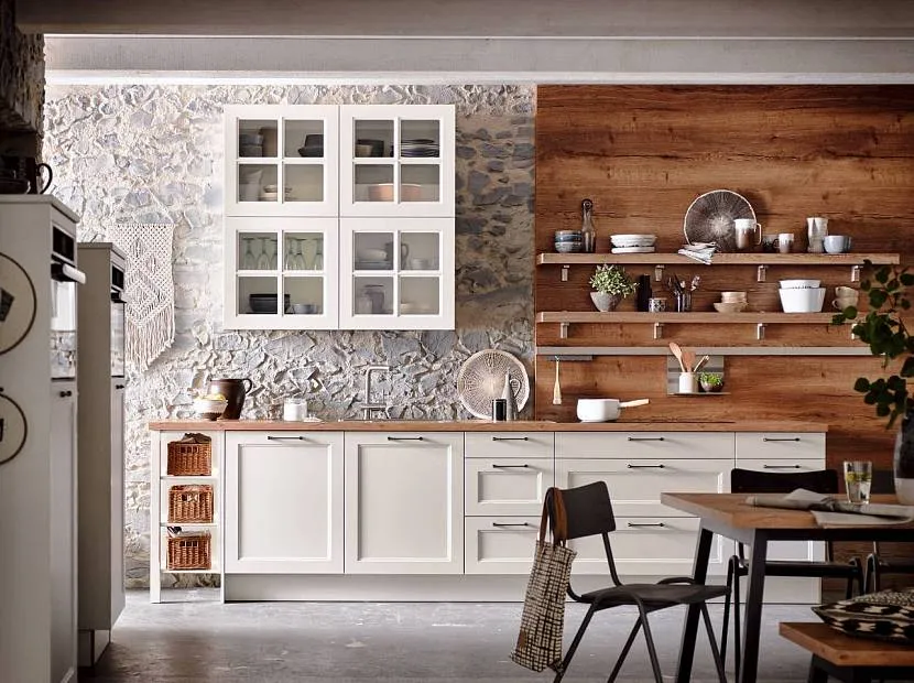 Фартук оформляют плиткой под кирпич или камень. Керамику же используют и для напольного покрытия. Мебель лучше выбирать деревянную; хорошо будет смотреться сочетание светлого и тёмного дерева в одном помещении.