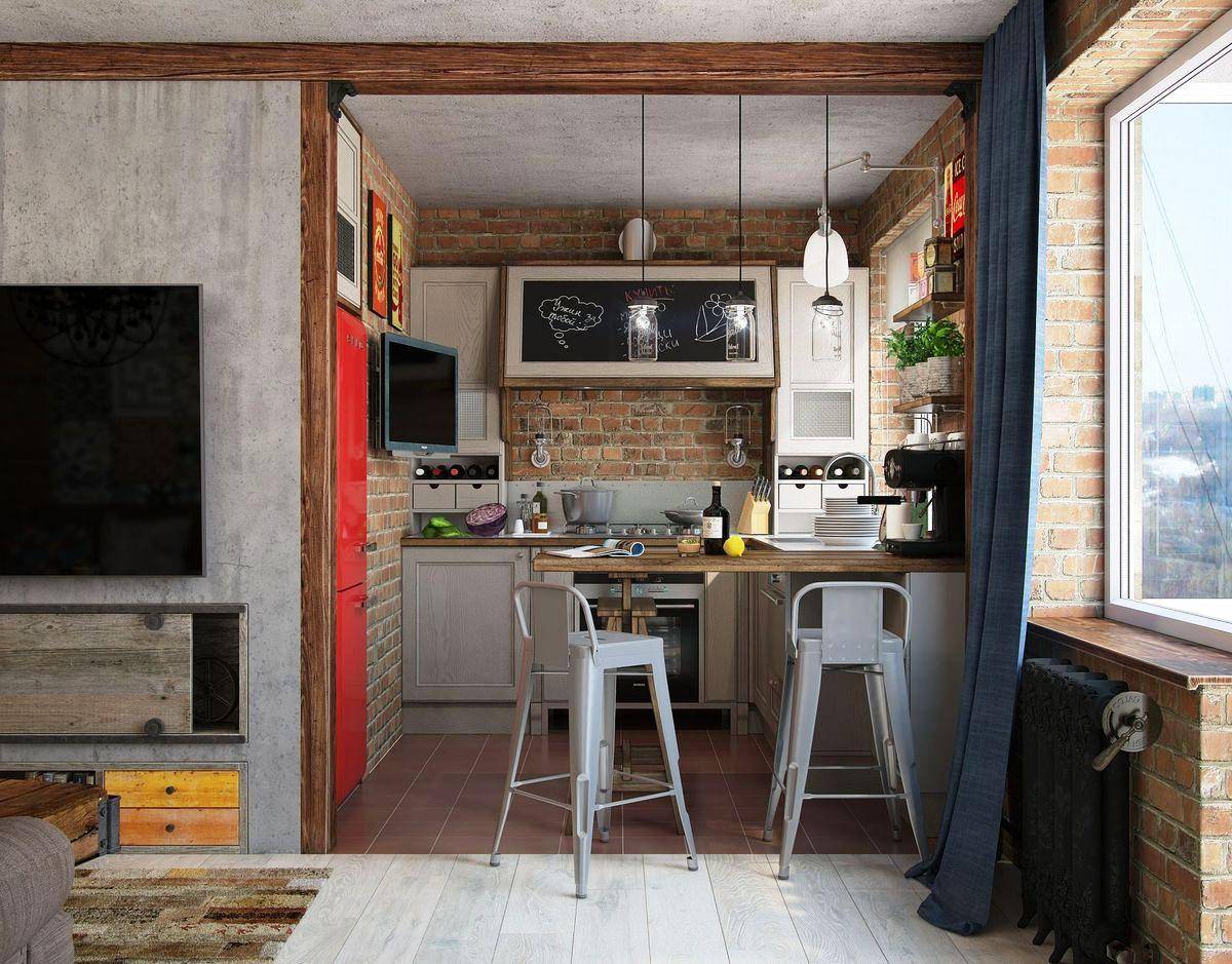 Чаще Лофт выбирают для крупных кухонь (в том числе совмещённых с гостиной), но его облегчённый вариант подойдёт и тесному помещению. Стены могут быть отделаны штукатуркой под бетон или стилистически нейтральным покрытием типа светлой моющейся краски.