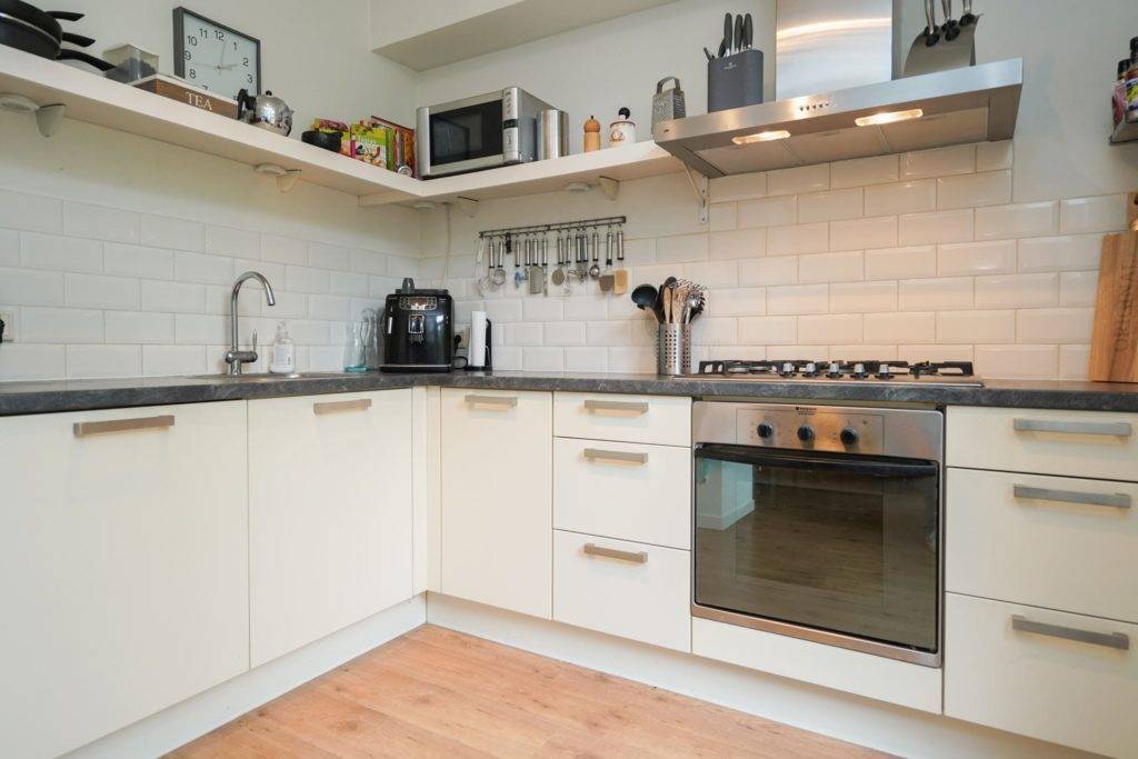 - прямая. Кухонный гарнитур располагается вдоль одной стены. Можно вместо кухонного гарнитура использовать подвесные полки и тумбу с мойкой;