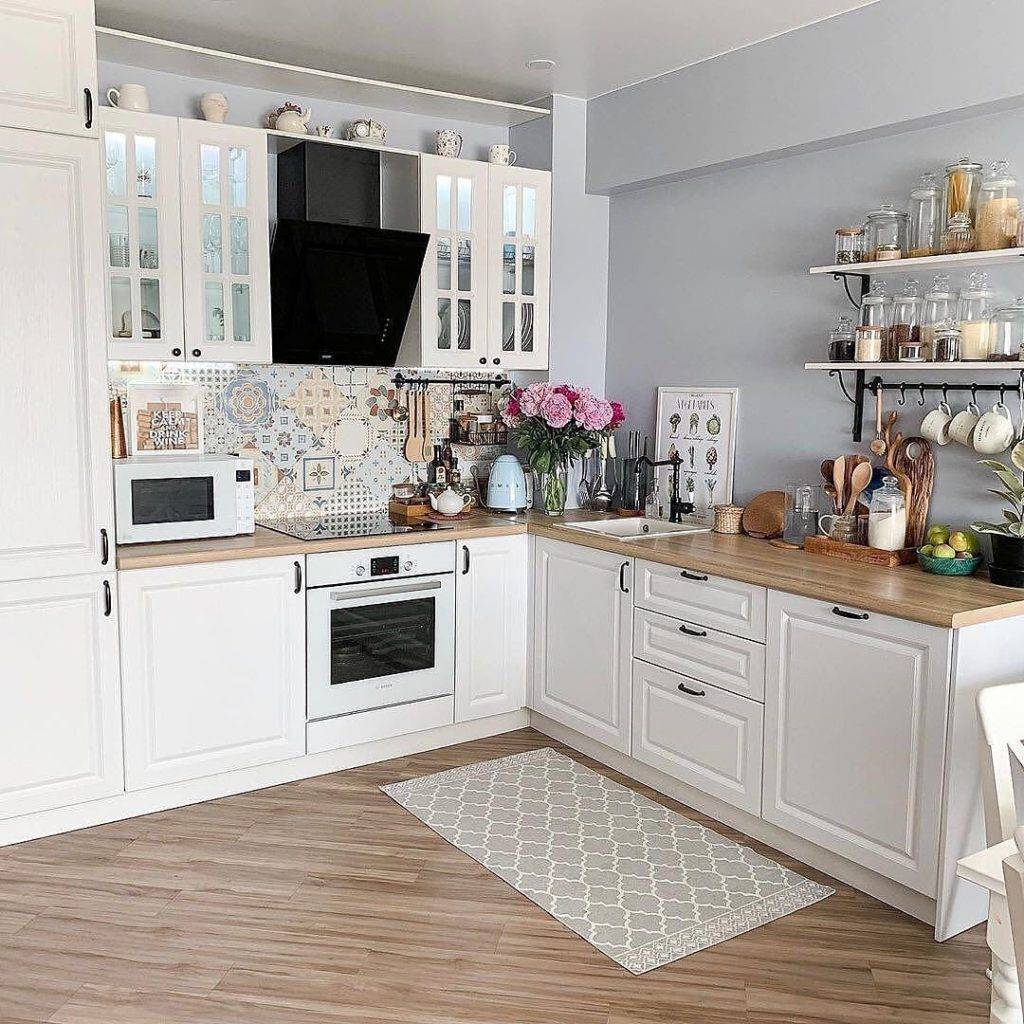 Небольшая угловая кухня с контрастным напольным покрытием
