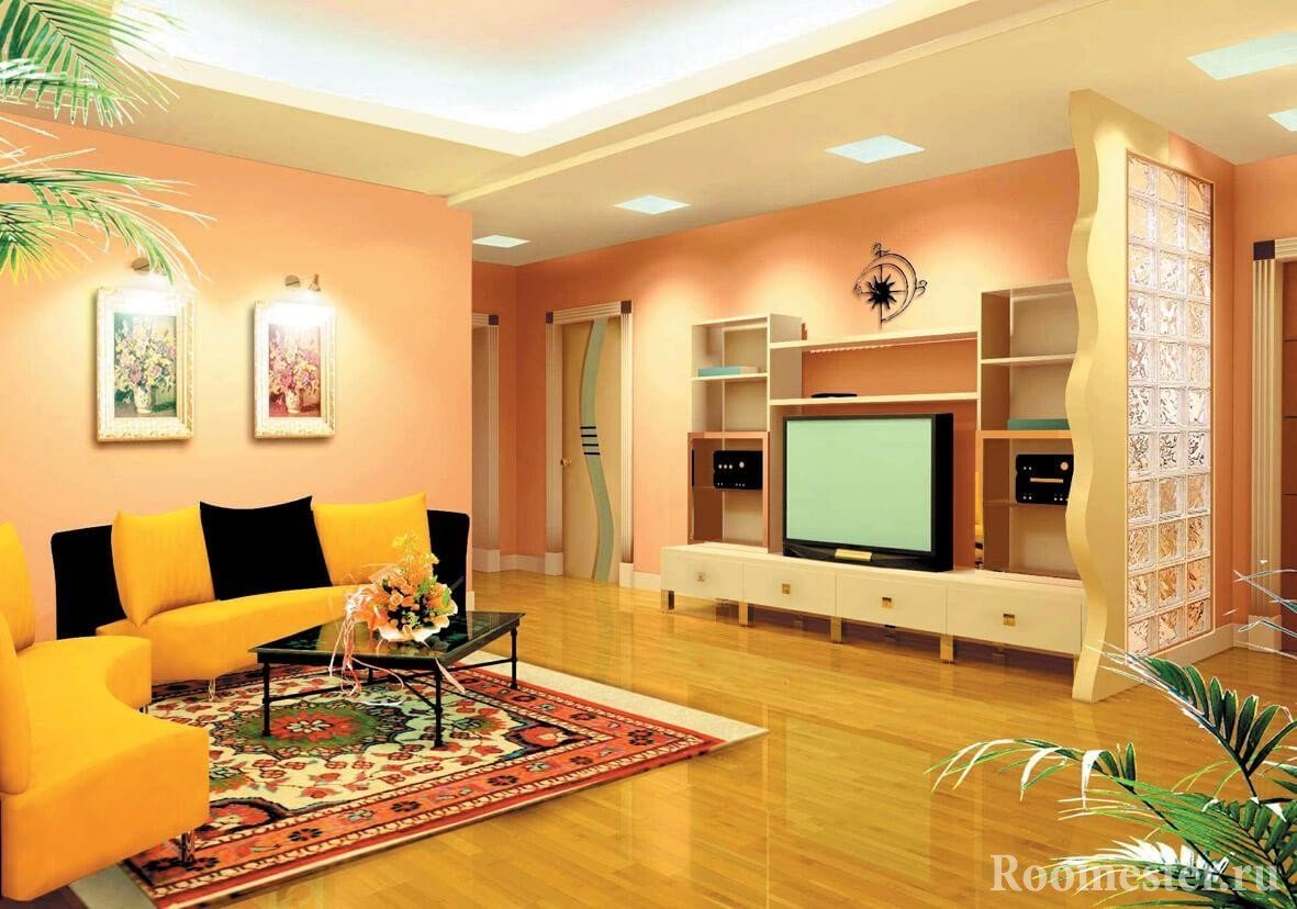 В главной комнате дома персиковый уместен как фоновый цвет и как дополнительный оттенок. Нарядный и парадный вид легко достижим при классическом исполнении. Тогда персиковый цвет в гостиной, даже в превалирующем количестве, будет уравновешен: